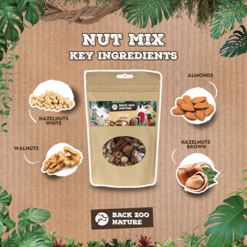 Health Benefits: The Back Zoo Nature Nut Mix is rich in essential nutrients that contribute to your pet's health. Walnuts provide omega-3 fatty acids, almonds are rich in vitamin E and fiber, and hazelnuts provide healthy fats and antioxidants.