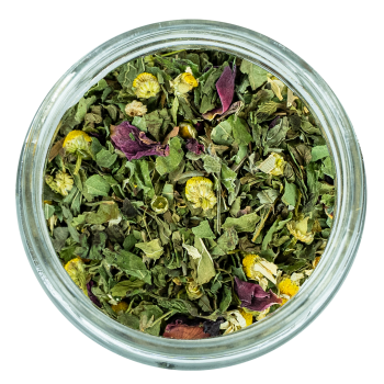 Samenstelling: Kruizemunt, kamillebloesem, citroenmelisse, bramenbladeren, aardbeibladeren, rozenblaadjes, sinaasappelbloesem