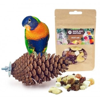 Daarnaast stimuleert deze dennenappel het natuurlijke ontdekkingsgedrag van jouw vogel. Vogels zijn van nature nieuwsgierig en zullen aan deze dennenappel knabbelen, knagen en klimmen om te ontdekken wat voor leuks deze te bieden heeft. Om dit nog interessanter voor je vogel te maken en natuurlijk foerageergedrag te stimuleren, kun je zijn favoriete snack of lekkere stukjes fruit of noten uit de Back Zoo Nature Fruit Mix, Vegetable & Fruit Mix of Nut Mix gebruiken om tussen de schubben te verstoppen. Met Arabic Gum kun je de stukjes goed vastplakken tussen de schubben van de dennenappel en moet jouw vogel extra zijn best doen om het voedsel te pakken te krijgen. In de natuur moeten ze immers ook moeite doen om aan voedsel te komen!