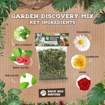 De Garden Discovery mix is een natuurlijke en avontuurlijke mix samengesteld uit zorgvuldig geselecteerde ingrediënten zoals kamille, pastinaak, peterselie, wortels, dille, rode biet, hazelnootblad, rozenbloemen, weegbree, paardenbloemblad, goudsbloem, groene tarwe, berkenblad, framboosblad en walnootblad.