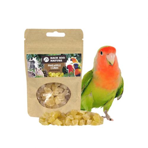 De Pineapple Cubes van Back Zoo Nature zijn zorgvuldig gedehydrateerde ananasblokjes, gemaakt van vers en natuurlijk fruit, speciaal voor vogels en knaagdieren.