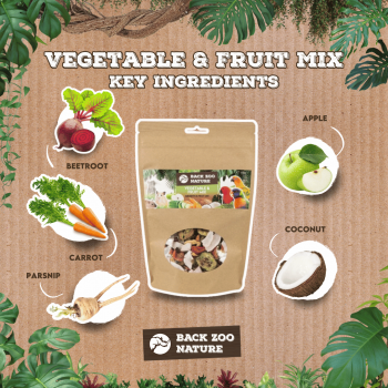 Gezondheidsvoordelen: De Back Zoo Nature Vegetable & Fruit Mix is rijk aan essentiële voedingsstoffen die bijdragen aan de gezondheid van je huisdier. Komkommer en wortel zijn voedzaam en hydraterend, appel is een bron van vezels, rode biet bevat antioxidanten, pastinaak is rijk aan vitaminen, en kokosvlokken voegen gezonde vetten toe.